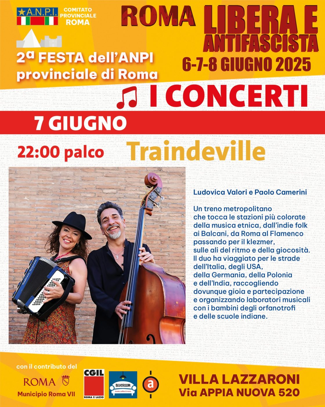Ludovica Valori alla voce, fisarmonica e trombone e Paolo Camerini al contrabbasso presenteranno al pubblico un repertorio scelto appositamente per celebrare l’ottantesimo anniversario della Liberazione dal nazifascismo. Appuntamento a Villa Lazzaroni sabato 7 giugno nell’ambito della seconda Festa Provinciale dell’Anpi Roma.