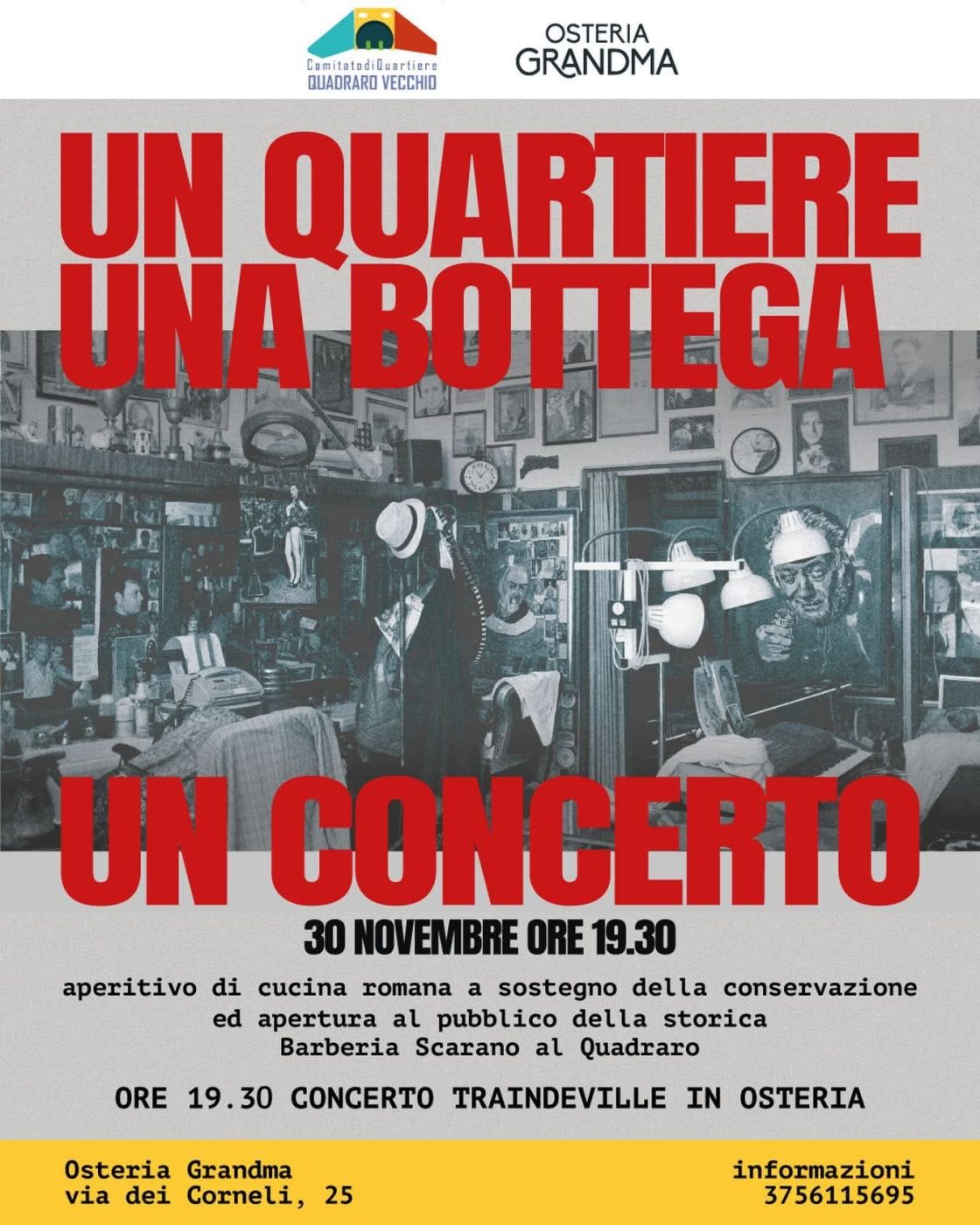 Domenica 30 novembre alle 19:30 al Grandma Quadraro un aperitivo solidale per sostenere la conservazione e l’apertura al pubblico della Barberia Scarano: una bottega storica simbolo del Quadraro, dove Gino Scarano ha tagliato capelli e raccontato storie a generazioni di abitanti e grandi nomi del cinema italiano come Alberto Sordi, Anna Magnani e Monica Vitti.