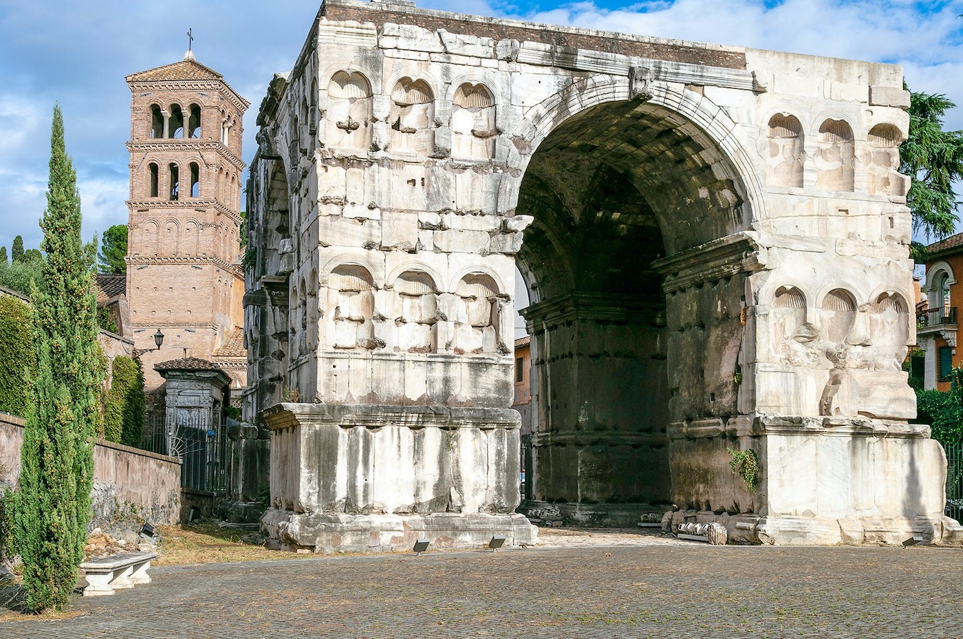 Nella suggestiva area del Velabro, tra Tevere e Foro Romano, è finalmente di nuovo accessibile il grande arco onorario a pianta quadrangolare, solitamente attribuito a Giano, divinità bifronte. Analizzeremo l’imponente struttura e la legheremo agli altri monumenti antichi presenti nella zona, primo tra tutti il vicino Arco degli argentieri.