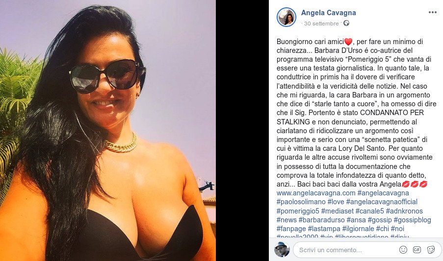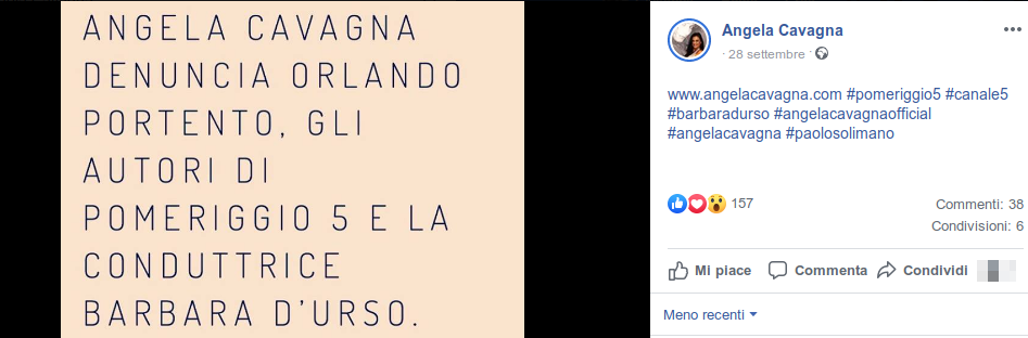 “Barbara D’Urso é co-autrice del programma televisivo ‘Pomeriggio 5’ che vanta di essere una testata giornalistica. Ha il dovere di verificare l’attendibilità e la veridicità delle notizie. Ha omesso di dire che il Sig. Portento è stato CONDANNATO PER STALKING e non denunciato. Permettendo al ciarlatano di ridicolizzare un argomento così importante e serio con una ‘scenetta patetica’”