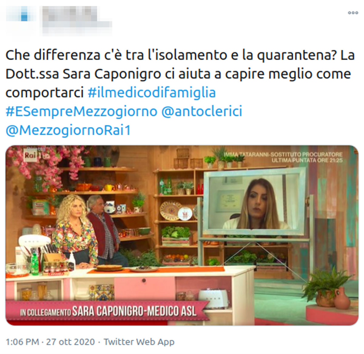 Tra i suoi nuovi ospiti c’è stata ad esempio Sara Caponigro, medico di base dell’ASL Roma, che ha fugato alcuni dubbi sulle differenze tra i termini “isolamento” e “quarantena”, finendo a parlare di Covid-19 anche in un programma che dovrebbe essere dedicato alla cucina.