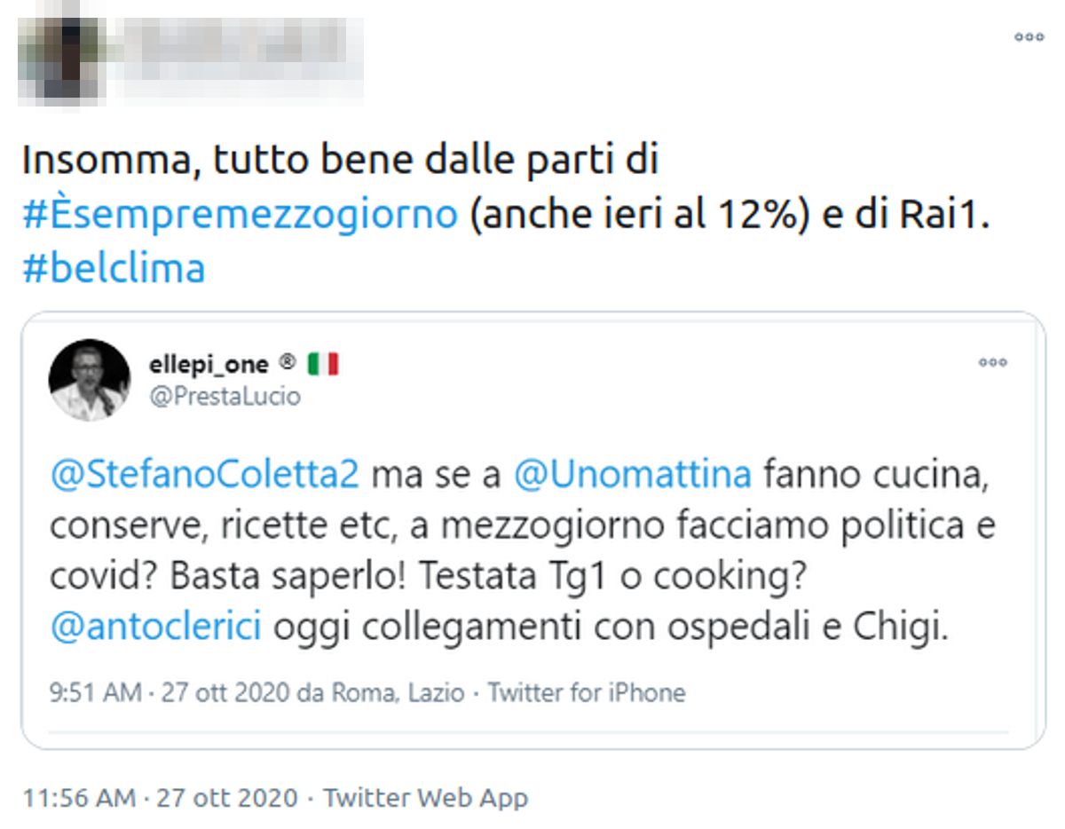 Tra i vari commenti è comparso anche quello di Lucio Presta, che su Twitter ha fatto un appello a Stefano Coletta, direttore di Rai Uno: “Ma se a Uno Mattina fanno cucina, conserve, ricette, etc… A mezzogiorno facciamo politica e Covid? Basta saperlo! Testata Tg1 o cooking? Antonella Clerici oggi collegamenti con ospedali e Chigi”.