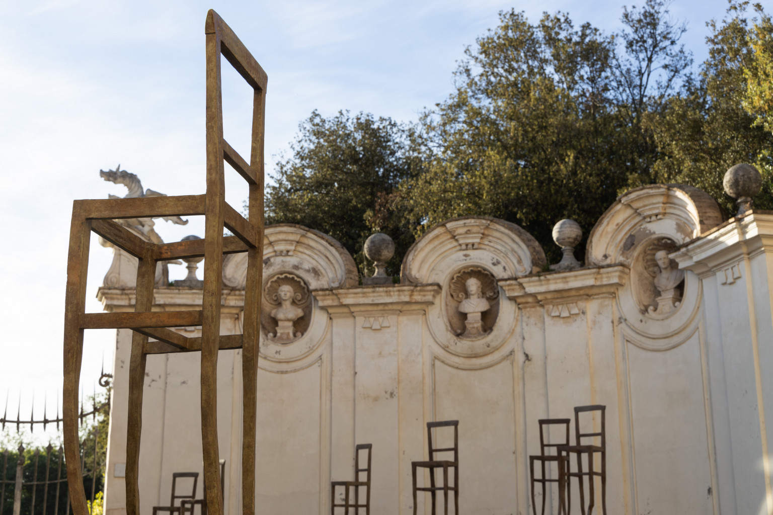 Emerso sulla scena internazionale grazie al gruppo della Scuola di San Lorenzo, Giuseppe Gallo conduce una ricerca personale tra la pittura e la scultura, che si muove tra la natura, la matematica e quell’idea classica di forma senza tempo. A Villa Borghese l’artista propone dodici sculture che hanno l’aspetto di sedie, ma non posso sostenere alcun peso, perché fragili e altissime. Le loro gambe salgono dal terreno come esili tronchi d’albero, in un dialogo silenzioso e pieno di mistero con gli spazi del parco storico. Evocano gli eroi del nostro tempo, fragili e caparbi, come la natura che ci circonda.