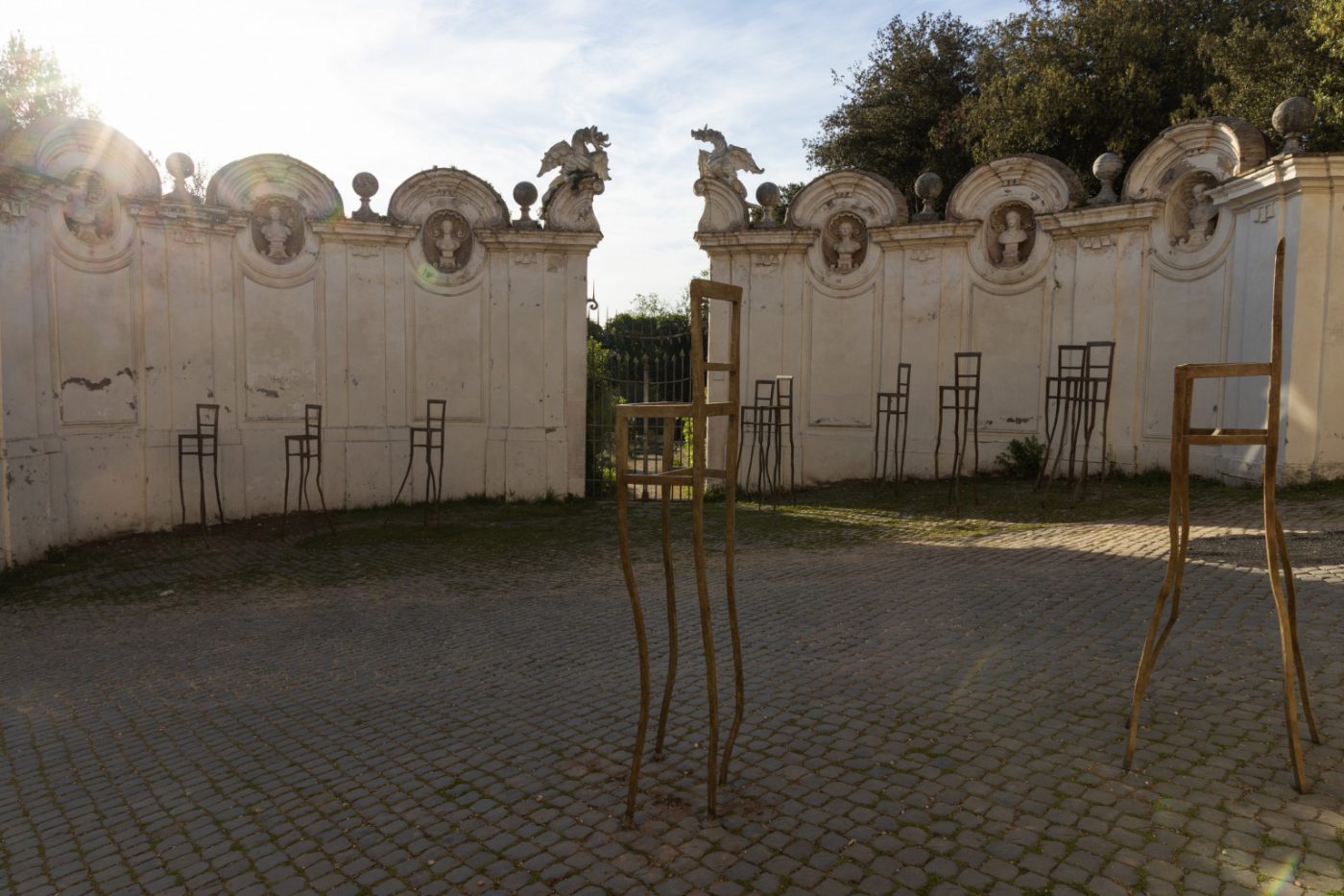 Emerso sulla scena internazionale grazie al gruppo della Scuola di San Lorenzo, Giuseppe Gallo conduce una ricerca personale tra la pittura e la scultura, che si muove tra la natura, la matematica e quell’idea classica di forma senza tempo. A Villa Borghese l’artista propone dodici sculture che hanno l’aspetto di sedie, ma non posso sostenere alcun peso, perché fragili e altissime. Le loro gambe salgono dal terreno come esili tronchi d’albero, in un dialogo silenzioso e pieno di mistero con gli spazi del parco storico. Evocano gli eroi del nostro tempo, fragili e caparbi, come la natura che ci circonda.