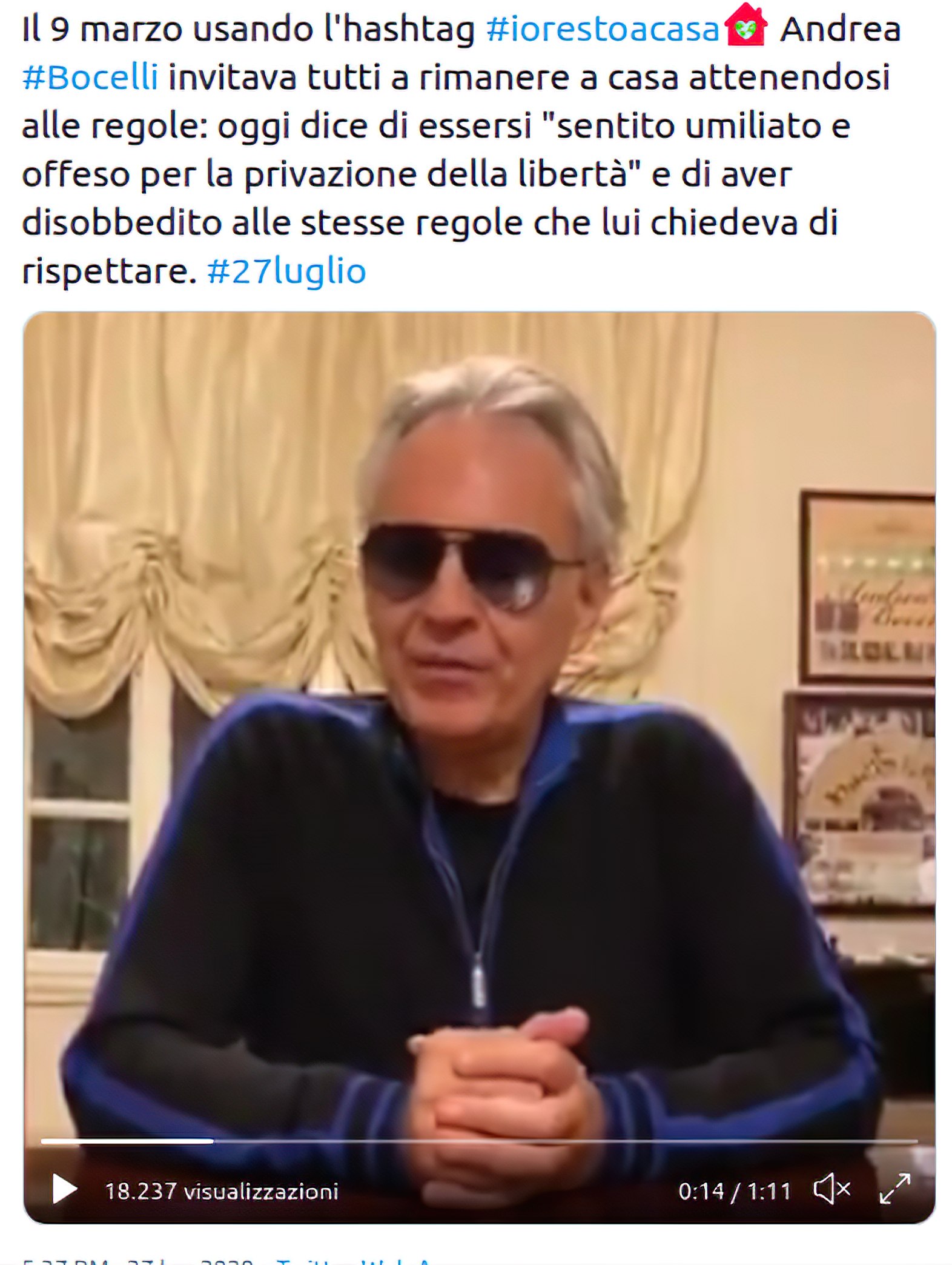 Parole dure e soprattutto polemiche, quelle di Bocelli sul Covid, che però il 9 marzo aveva pubblicato sui social un video di tutt’altro tenore, nel quale si diceva sicuro che osservando tutte le regole previste dagli esperti.