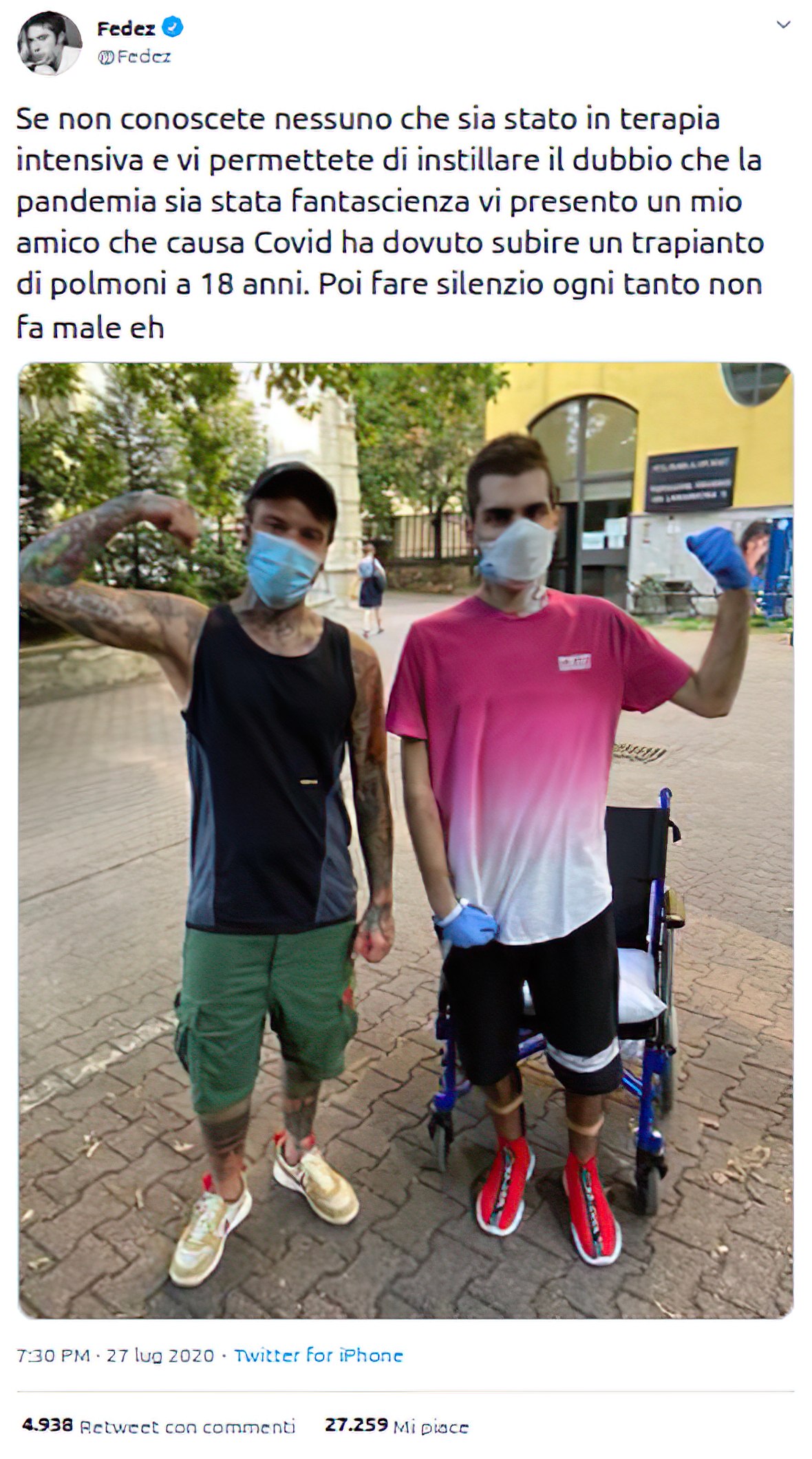 Il rapper ha pubblicato una foto nella quale si mostra con tanto di mascherina insieme ad un amico, scrivendo una didascalia che non lascia spazio a interpretazioni e, anzi, sembra proprio essere un riferimento a Bocelli: “Se non conoscete nessuno che sia stato in terapia intensiva e vi permettete di instillare il dubbio che la pandemia sia stata fantascienza vi presento un mio amico che causa Covid ha dovuto subire un trapianto di polmoni a 18 anni. Poi fare silenzio ogni tanto non fa male eh”.