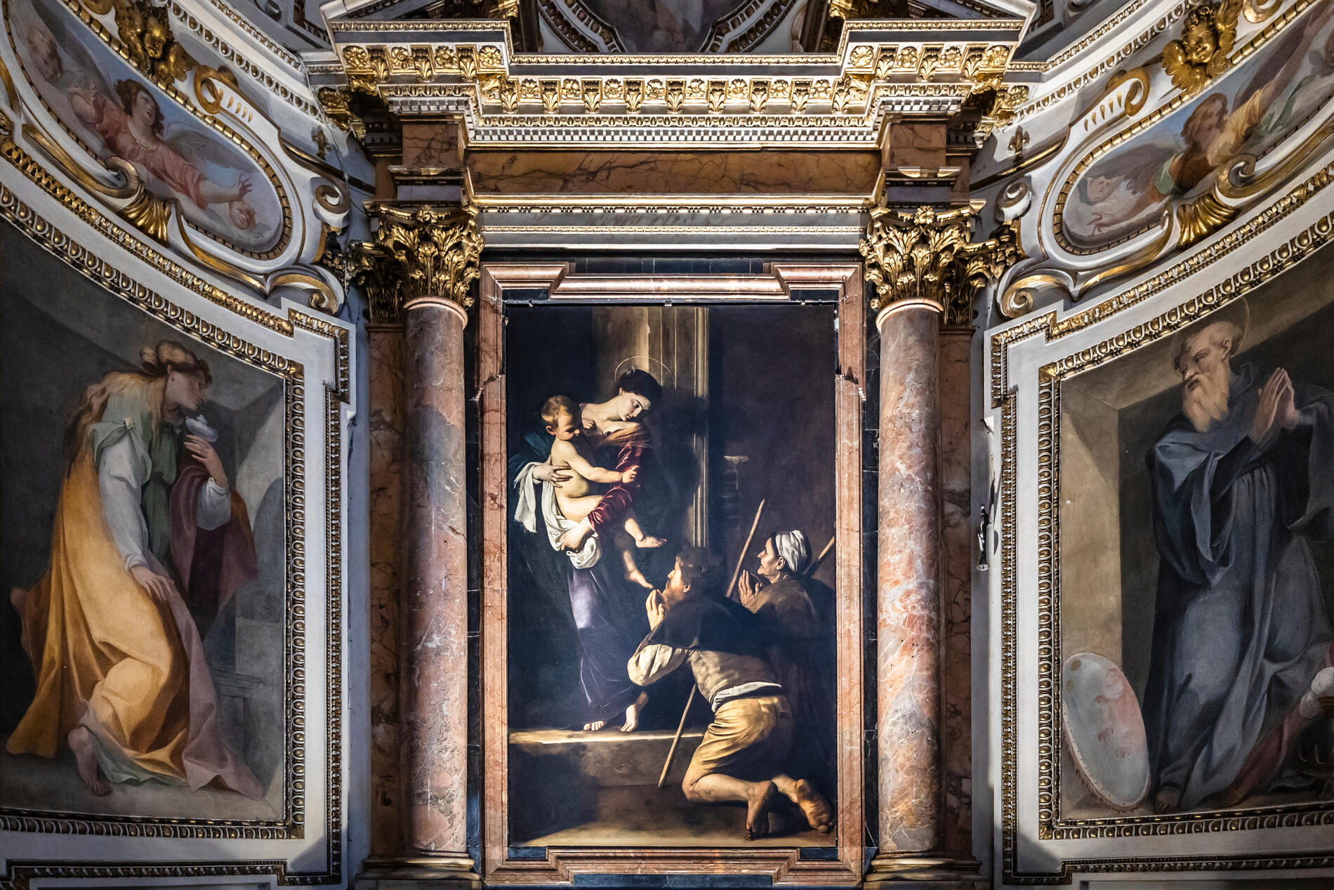 A due passi da Piazza Navona, la Cappella Cavalletti della Basilica di Sant’Agostino ospita la celebre Madonna dei Pellegrini. Al centro del dipinto non c’è la perfezione idealizzata ma la verità del reale: i piedi gonfi e sporchi dei pellegrini, simbolo di fede concreta. Fece scandalo per i contemporanei, oggi è una delle immagini più intense della pittura caravaggesca, segno di un’arte che eleva l’umano.