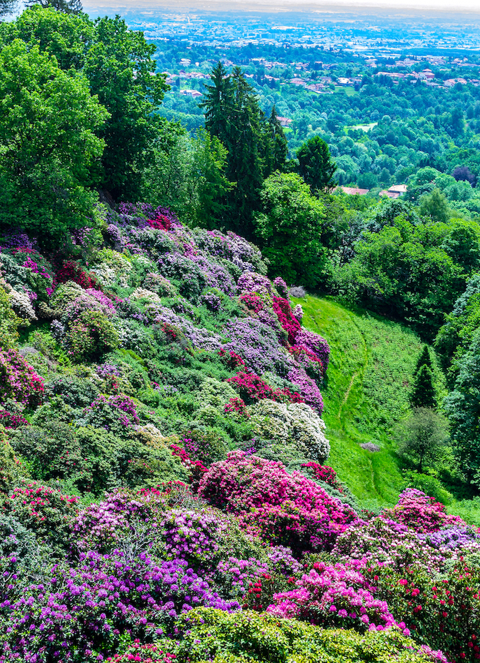 Ci troviamo in Piemonte ai piedi delle Alpi Biellesi, sulla cima della collina Brik Burcina. Qui il parco si estende per 57 ettari e tra le sue meraviglie c’è la conca dei rododendri: più di 1000 piante di circa 200 specie diverse, con colori che vanno da infinite sfumature di rosa al rosso acceso.