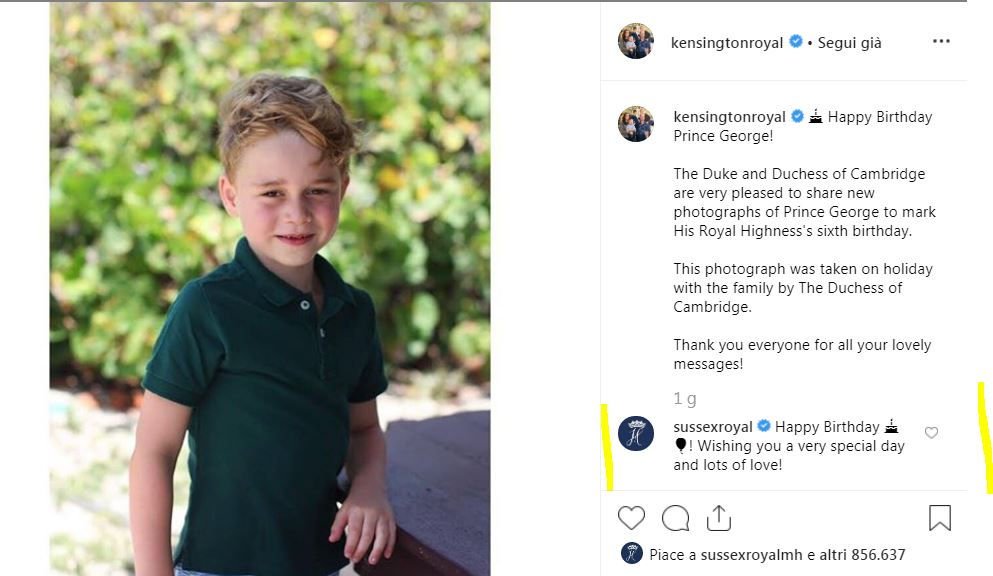 Per il compleanno del Principe George tanti gli auguri di compleanno tra cui quelli dello zio Harry e di Meghan Markle. Il commento sotto il post su Instagram ha scatenato un putiferio tra i fan: ecco gli auguri poco regali fatti da Harry e Meghan