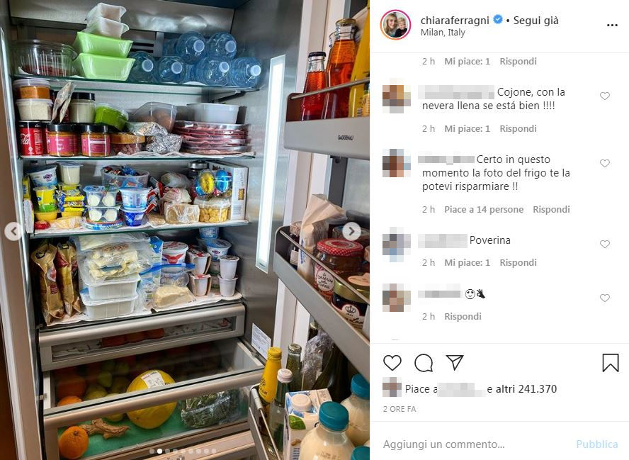 Tuttavia, una foto del frigo pieno della nota influencer non è piaciuta molto ai suoi follower. C’è chi se la prende con lei perché – dato il momento – condividere l’immagine di un frigorifero stracolmo sarebbe una mancanza di rispetto per chi ha perso il lavoro a causa di questa emergenza…