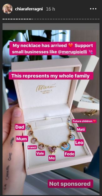Nella foto pubblicata nelle IG Stories, Chiara Ferragni ha tenuto a precisare che quella collana l’ha acquistata di tasca proprio e non era cioè un presente dell’azienda che la produce. Non a caso, l’influencer, ha scritto ‘Non Sponsored’ sull’immagine. Ma quanto ha pagato Chiara per quel gioiello con i ritratti di famiglia? Essendo un prodotto personalizzato è difficile risalire al prezzo esatto, sappiamo però che le collane simili a quella mostrata dalla Ferragni hanno un costo che oscilla dai 1500 euro a quasi 4 mila euro.