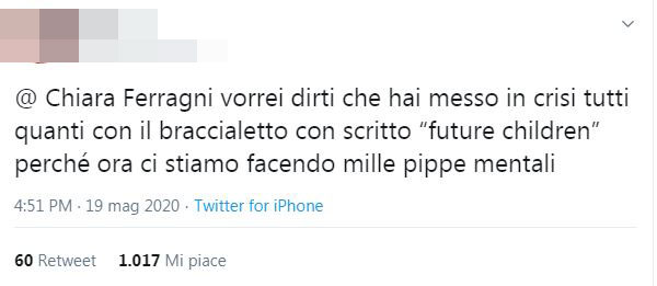 Non sapevo niente di questa cosa, quindi grazie Twitter, davvero. Comunque no, ragazzi non è incinta, credo si sia portata avanti, non è normale, non so perché lo faccia, davvero, non chiedetemi perché lo faccia, ma non è incinta. Il future children penso che sia il bambino che verrà” dice il marito di Chiara tra il divertito e l’imbarazzato.
