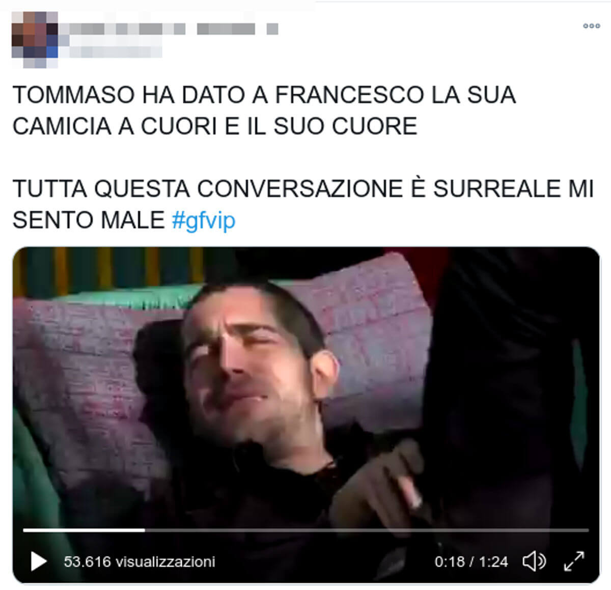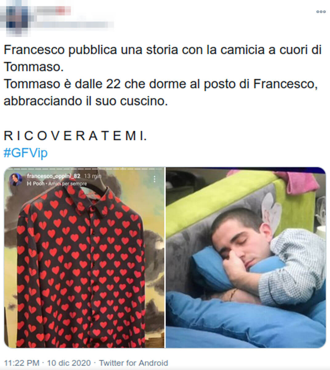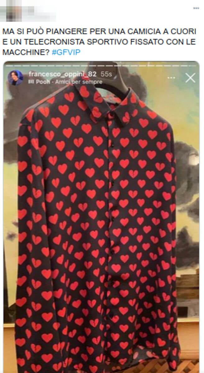 “Francesco pubblica una storia con la camicia a cuori di Tommaso Tommaso è dalle 22 che dorme al posto di Francesco, abbracciando il suo cuscino. R I C O V E R A T E M I”, ha subito scritto una persona. E ancora: “Ma si può piangere per una camicia a cuori e un telecronista sportivo fissato con le macchine?”
