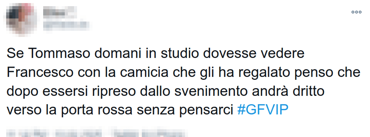 “Se Tommaso domani in studio dovesse vedere Francesco con la camicia che gli ha regalato penso che dopo essersi ripreso dallo svenimento andrà dritto verso la porta rossa senza pensarci”, ha chiosato su Twitter una telespettatrice. Quale sarà la verità? Succederà davvero?
