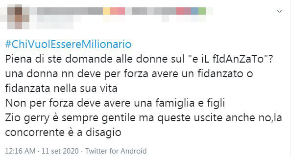 “Piena di ste domande alle donne sul fidanzato. Una donna non deve per forza avere un fidanzato o fidanzata nella sua vita. Non per forza deve avere una famiglia e figli. Zio Gerry è sempre gentile ma queste uscite anche no, la concorrente è a disagio” osserva con particolare fastidio un utente.