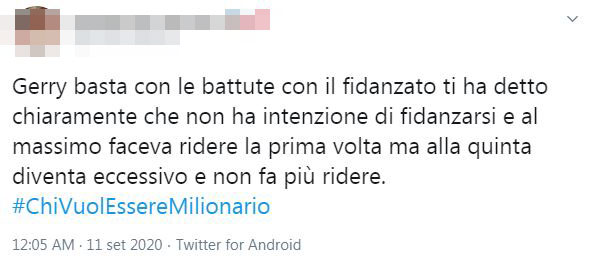 “Gerry, basta con le battute con il fidanzato, ti ha detto chiaramente che non ha intenzione di fidanzarsi e al massimo faceva ridere la prima volta ma alla quinta diventa eccessivo e non fa più ridere” aggiunge un altro telespettatore.