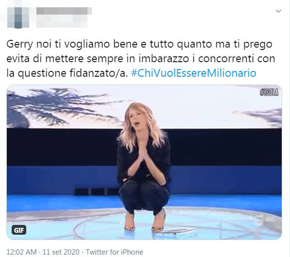 E ancora: “Gerry noi ti vogliamo bene e tutto quanto ma ti prego evita di mettere sempre in imbarazzo i concorrenti con la questione fidanzato/a”.