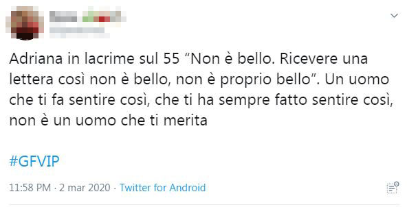 Il pubblico, intanto, si schiera con la conduttrice e qualcuno fa notare la mancanza di sensibilità di Roberto, suo marito. L’uomo, inoltre, sarebbe anche poco lungimirante nelle sue scelte, come sostiene una utente di Twitter che cinguetta: “Comunque Roberto tattica zero stasera si è giocato il matrimonio. Lui intima ad Adriana di allontanarsi da Denver, Denver di conseguenza non la salva, lei inizia a incuriosirsi e fa ricadere la colpa sul marito. Adriana innamorata di Denver da stasera. È matematico”.