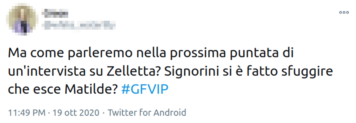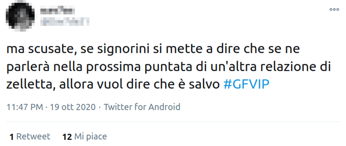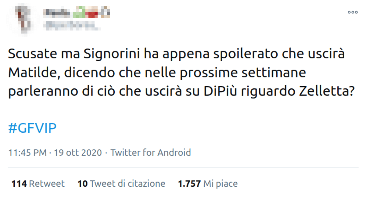 Stando alle parole del conduttore del GF Vip, la prossima settimana si parlerà in studio di un’intervista sulle relazioni di Andrea Zelletta che uscirà su Di Più. Una normalissima comunicazione che, però, fatta prima della chiusura dei giochi del televoto si trasforma in uno spoiler grande quanto una casa (quella più spiata d’Italia, sic!).