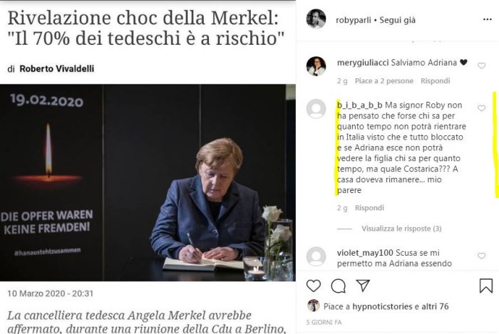 In questi giorni c’è anche preoccupazione per Roberto Parli, il marito di Adriana Volpe: secondo le ultime notizie, l’uomo si troverebbe in Costarica con la figlia Gisele, ma il profilo social non è aggiornato da tempo e ci si chiede se sia in difficoltà per rientrare in Italia.