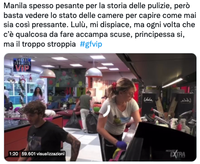 Inevitabilmente è arrivato lo scontro tra Manila e Lulù in merito proprio alle pulizie: “Lulù dimmi tu cosa vuoi fare con il mio turno, perché sono tre volte che non ti fai vedere: se vuoi stare in questo gruppo devi collaborare, vuoi fare qualcosa o no? Se no vai nel gruppo con Jessica. Mi spiace: così non va bene”.
