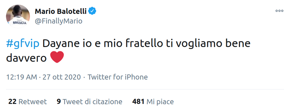 Prima Mario Balotelli ha scritto: “Dayane, io e mio fratello ti vogliamo bene davvero”.