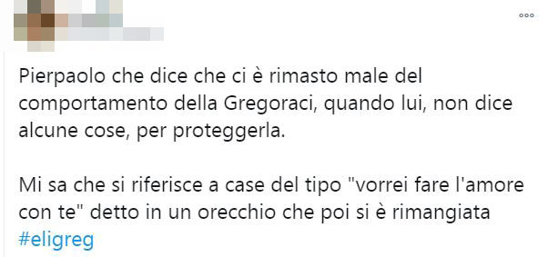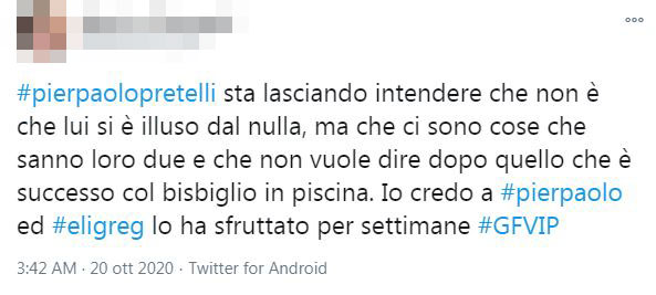 Pierpaolo è molto deluso da Elisabetta Gregoraci. Lui è preso da lei, che invece continua a mantenere le distanze, nonostante lo cerchi spesso e gli stia vicino. Nella notte, dopo la puntata, Pretelli si è sfogato con i suoi coinquilini facendo intendere che ci sono discorsi che ha fatto con Ely che non può rendere pubblici e che non si è illuso su una eventuale storia con lei: è stata la stessa Gregoraci a fargli credere che ci spossa essere qualcosa in più della famosa amicizia speciale?