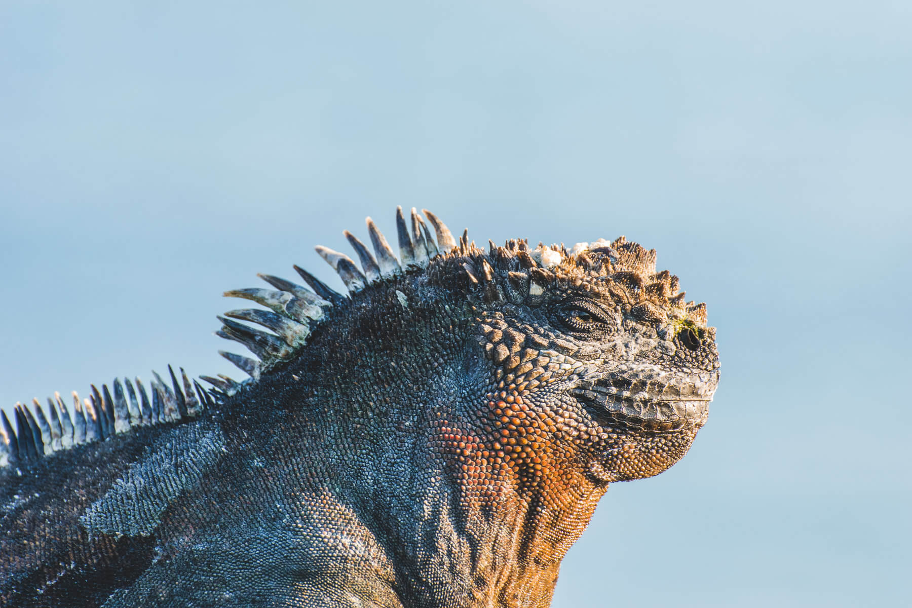 Le iguane marine sono inoltre del tutto pacifiche: mentre si godono il sole, grossi granchi rossi passano e ripassano sopra di esse, pizzicandone e tirandone la pelle asportando zecche ed altri parassiti! Un lavoro molto utile, soprattutto perché alle iguane non costa alcuna fatica!
