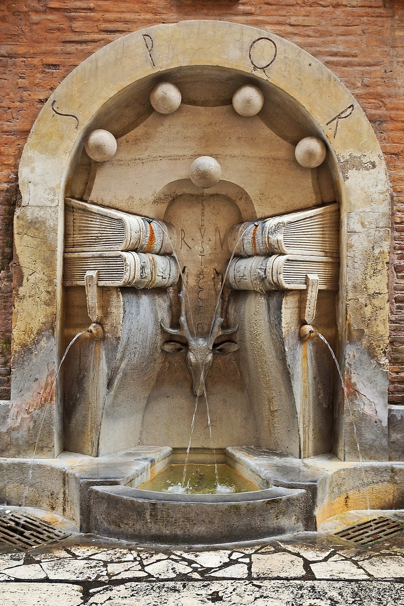 La fontana in travertino è posta in una nicchia, sormontata da un arco a tutto sesto decorato dalla scritta S.P.Q.R. scolpita. Sotto l’arco troviamo il simbolo del rione Sant’Eustachio – la testa di cervo – circondata da quattro tomi, due per lato – un riferimento all’Università della Sapienza. Dalle cannelle a forma di segnalibri zampilla l’acqua che va’ a raccogliersi nella vasca in basso.