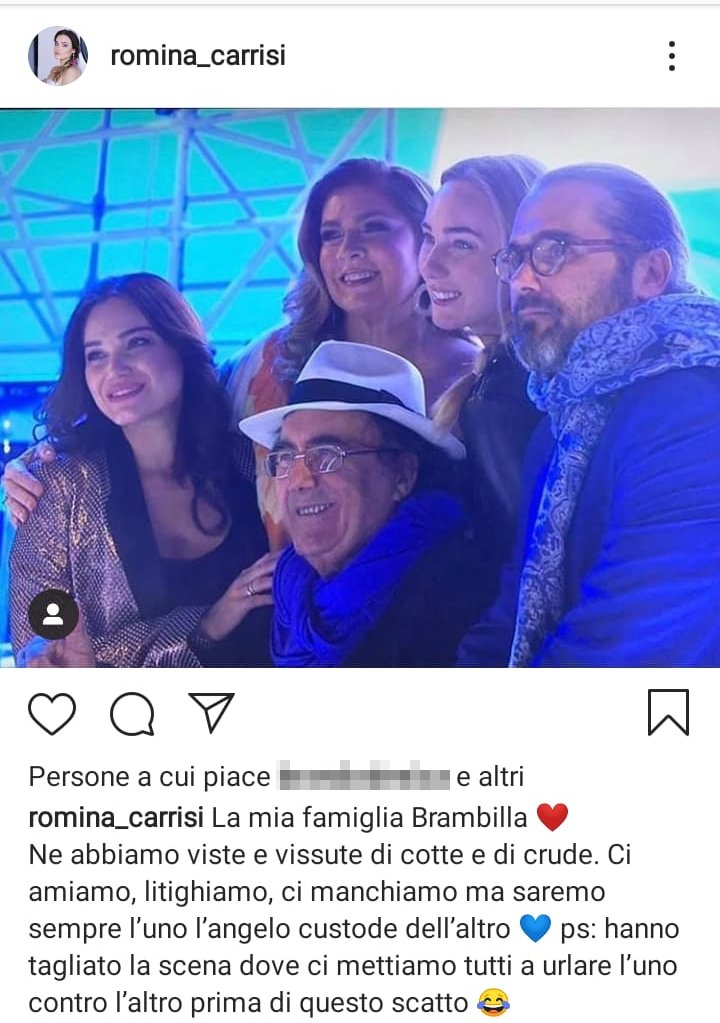 “La mia famiglia Brambilla – esordisce la figlia di Al Bano e Romina – Ne abbiamo viste e vissute di cotte e di crude. Ci amiamo, litighiamo, ci manchiamo ma saremo sempre l’uno l’angelo custode dell’altro. Ps: hanno tagliato la scena dove ci mettiamo tutti a urlare l’uno contro l’altro prima di questo scatto”.