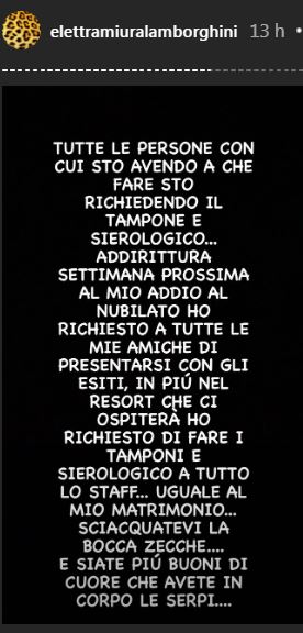 Elettra Lamborghini fa sapere inoltre di aver chiesto tampone e test sierologico a tutte le persone con cui si sta relazionando. Le sue amiche che parteciperanno all’addio al nubilato sono state invitate a presentarsi alla festa con l’esito del test. Non solo: la cantante ha chiesto al resort che l’ospiterà di fare il tampone a tutto lo staff.