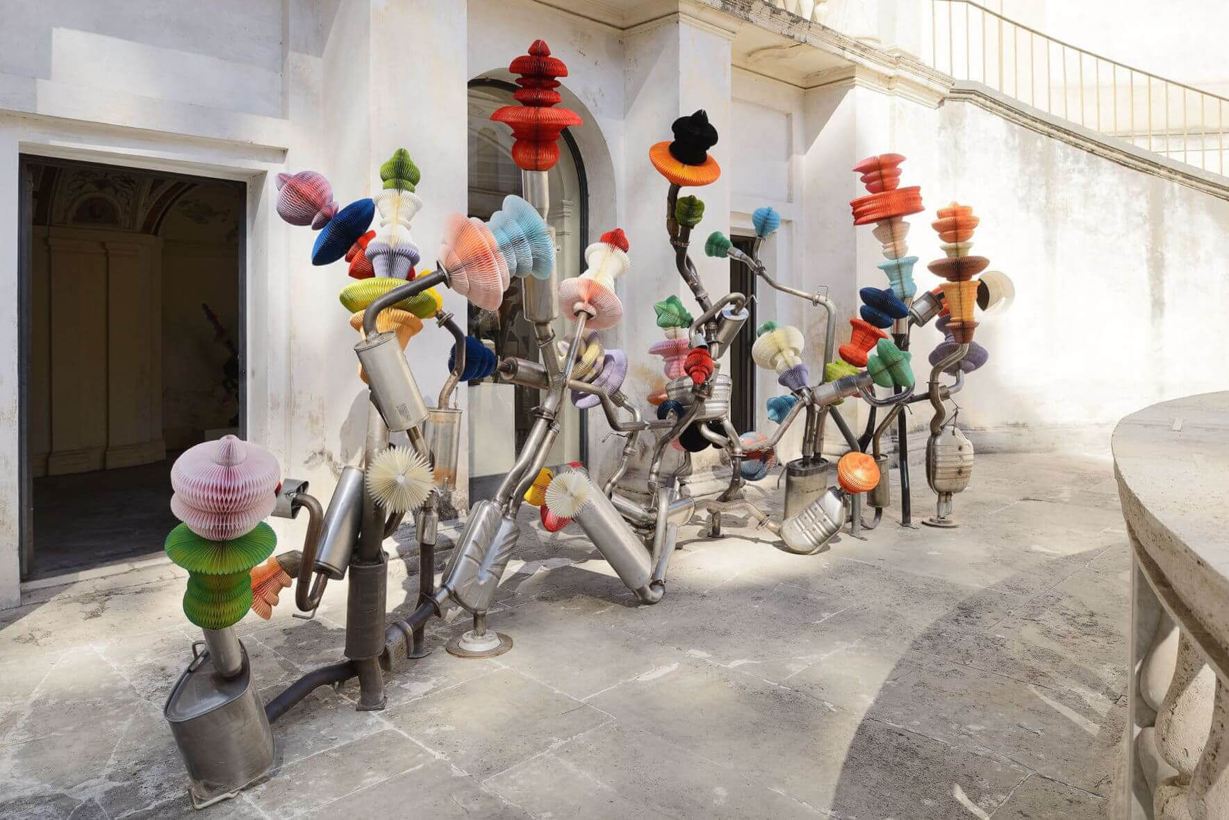 La mostra è composta da nove installazioni biomorfiche composte da motori, lamiere e carta impermeabile, che dialogano con l’architettura rinascimentale del Ninfeo. L’artista, nato a Tokyo nel 1983, intreccia materiali industriali e origami per riflettere sulla fragilità del presente. Il suono, parte integrante delle opere, evoca la vitalità della vita quotidiana.