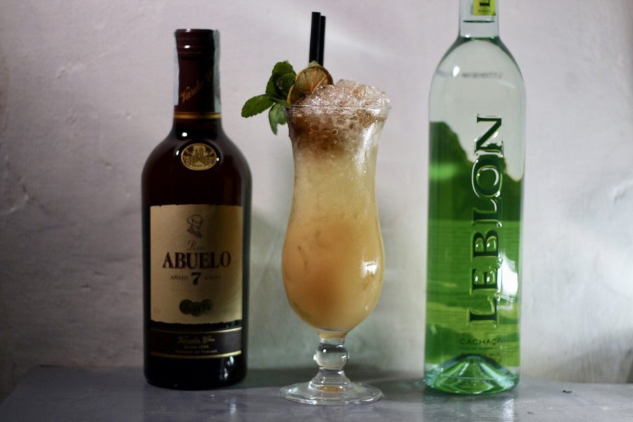 Versare tutti gli ingredienti in uno shaker, mescolare con un barspoon e shakerare con vigore. Filtrare il tutto in un bicchiere hurricane con ghiaccio a cubi e aggiungere del ghiaccio tritato sul quale versare il bitter.