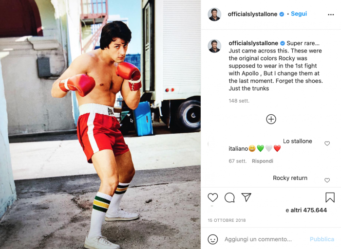 “Super raro…Appena ritrovata. Questi erano i colori originali che Rocky doveva indossare nel suo primo scontro con Apollo. Ma li ho cambiati all’ultimo momento. Dimenticate le scarpe, solo i pantaloncini”