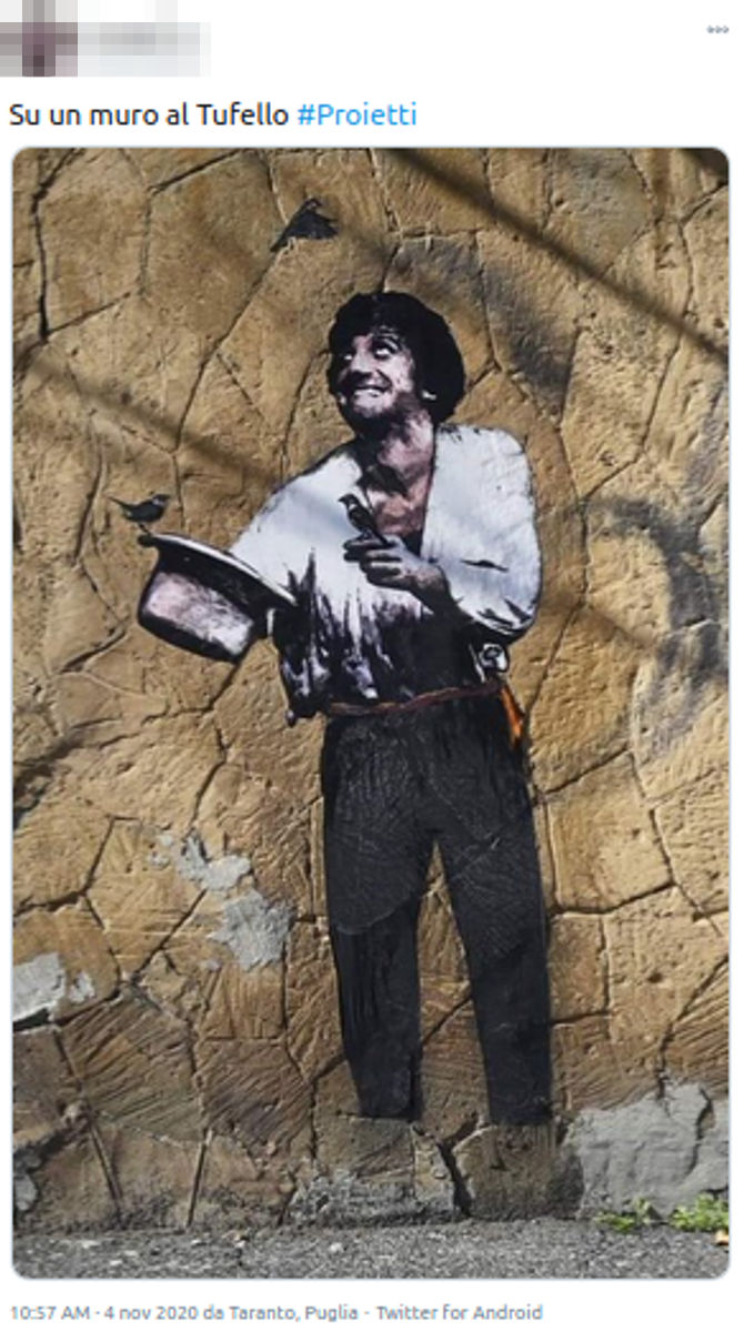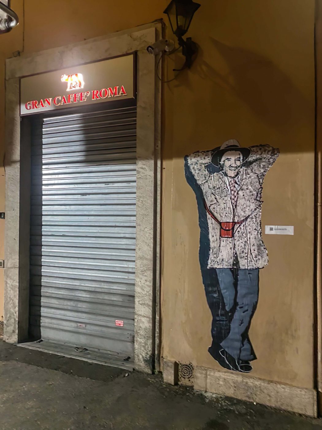 Ma, nel frattempo, in quelle strade il suo volto è già comparso sui muri, a partire da Via Capraia, dove Harry Greb ha realizzato un murale che ritrae un giovanissimo Proietti, circondato da passeri e usignoli, col cappello in mano e lo sguardo rivolto al cielo, come in una scena dello spettacolo teatrale ‘A me gli occhi please’, il suo primo grande successo nel teatro italiano.
