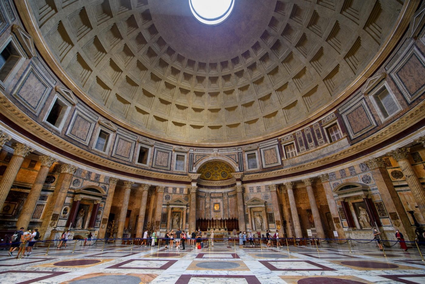 Tra il 4 e il 6 settembre, a mezzogiorno, il sole entra dall’oculo del Pantheon e illumina con precisione l’arco sopra il grande portone. Questo “sigillo luminoso” non è un fenomeno casuale: il diametro dell’oculo corrisponde quasi esattamente a quello dell’arco, creando un effetto architettonico e visivo unico.