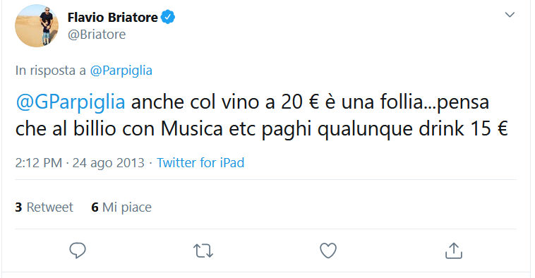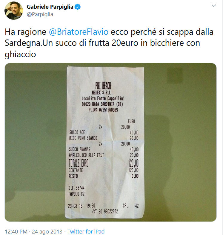 “Ha ragione Flavio Briatore – scrisse Parpiglia – ecco perché si scappa dalla Sardegna. Un succo di frutta 20euro in bicchiere con ghiaccio”.