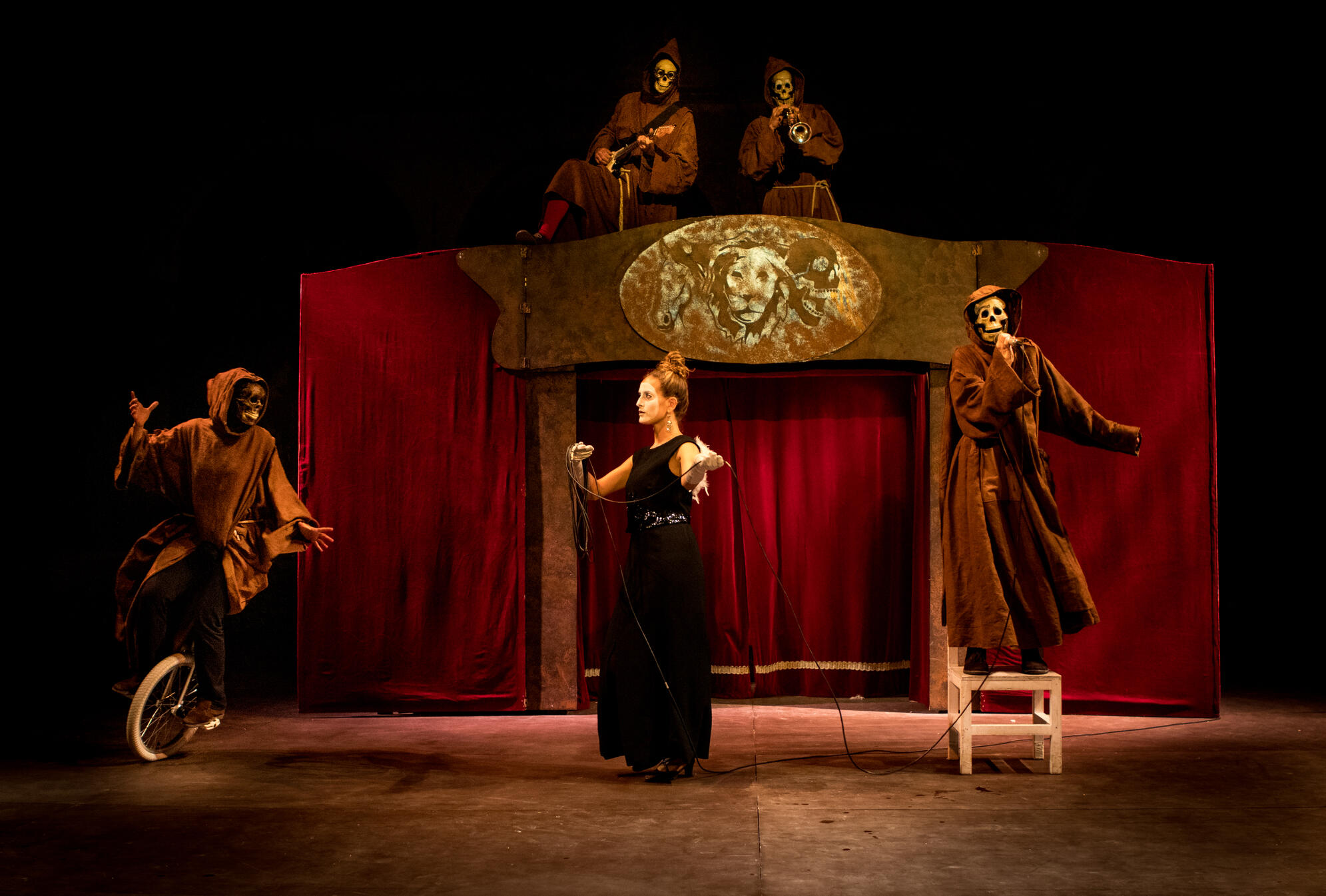 The Yoricks è uno spettacolo che rielabora l’antico tema europeo della Danza Macabra attraverso il linguaggio del clown e del teatro fisico. In scena clown e monaci-scheletro, angeli e figure simboliche danno vita a un intermezzo comico e grottesco che affronta la morte con leggerezza, rovesciamento e sorpresa.