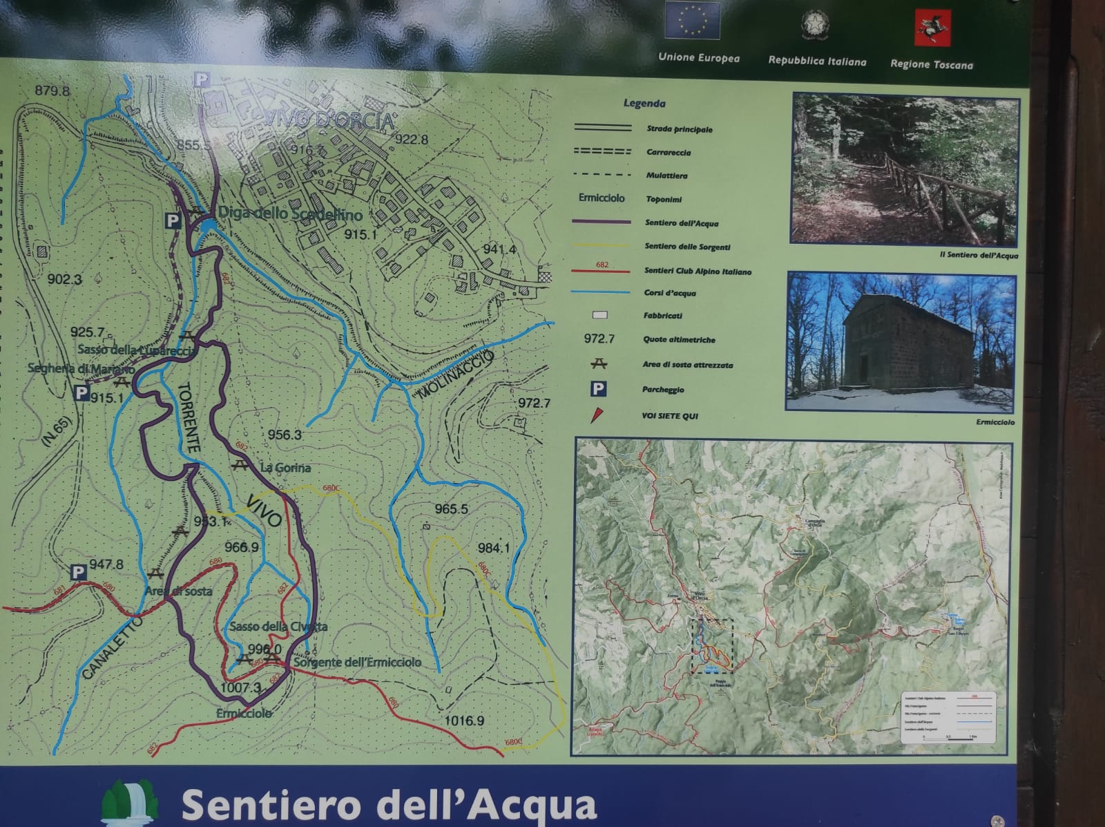Durante il percorso i passanti potranno incontrare tracce di antichi opifici costruiti per sfruttare l’energia idrica del torrente come segherie, ferriere, mulini. Poi si raggiunge il poggio dell’Ermicciolo vicino al quale si trova la struttura dell’acquedotto costruito fra il 1908 e il 1914 e accanto vi è la piccola chiesa romanica di San Benedetto. Il luogo così ameno viene descritto anche dal Papa Pio II nel 1462.