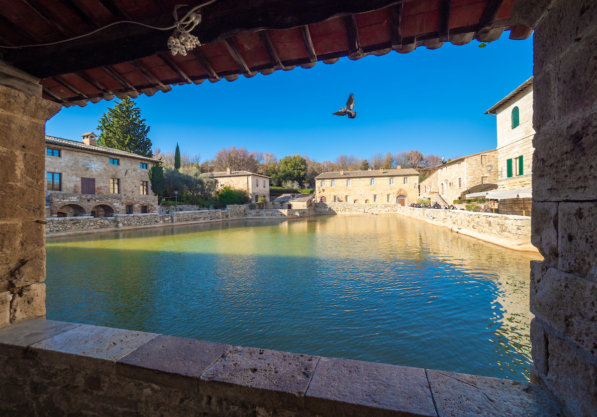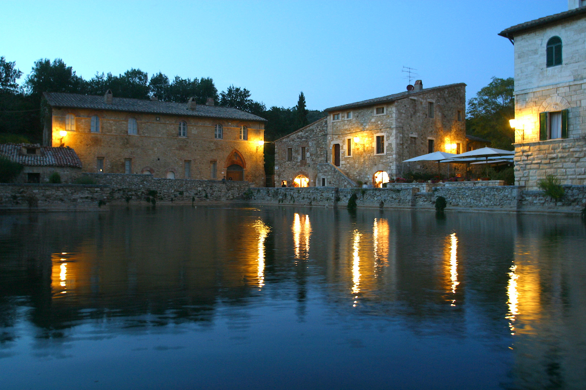 Celebre per essere una località termale nosta già in epoca romana, Bagno Vignoni rimane impressa nella mente oltre che per la sua bellezza, per la particolare e unica ‘piazza’. Non si tratta di un impianto classico come siamo soliti vedere: essa è costituita da una piscina di 49 metri realizzata sopra una fonte di acqua termale, la stessa usata anche dai romani.