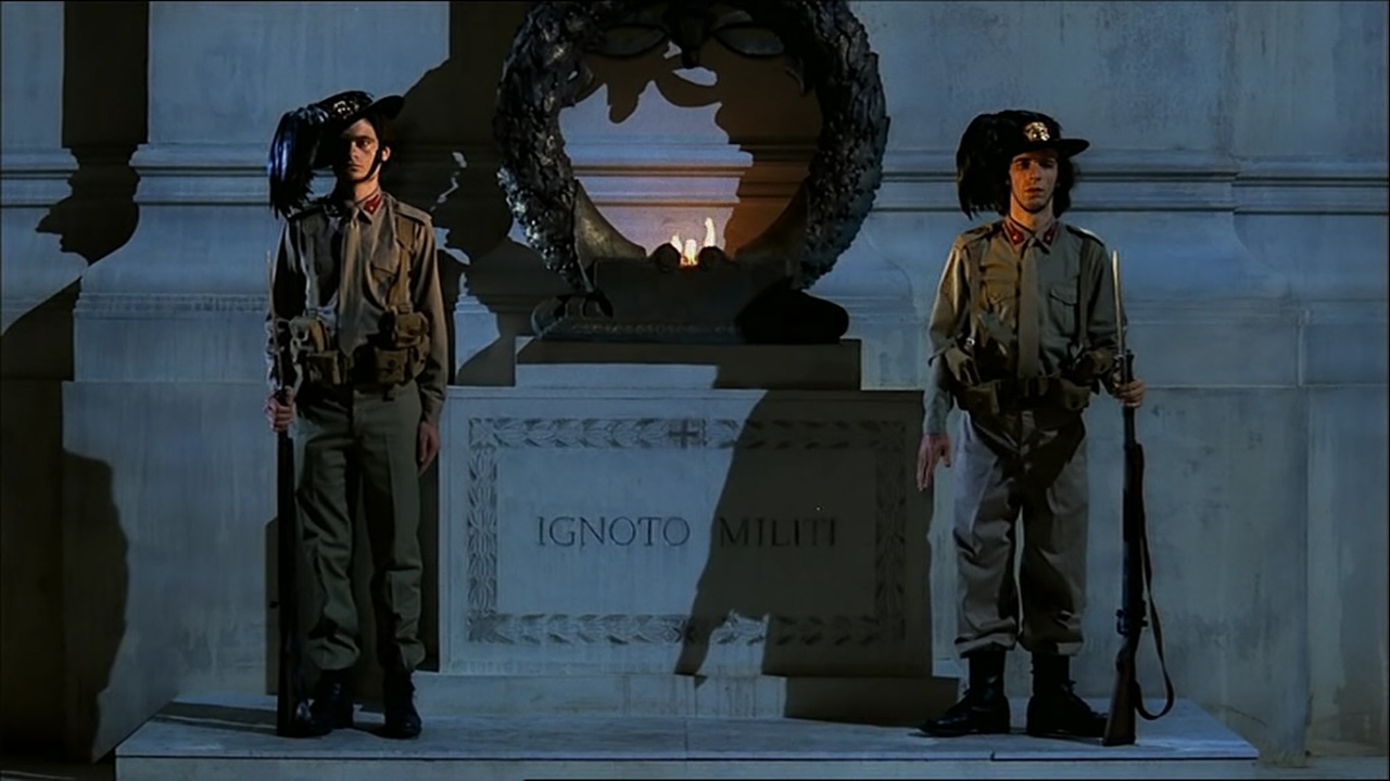 Tu mi turbi, che fece vincere a Begnini il David di Donatello come miglior regista esordiente, affronta il tema della figura di Dio attraverso quattro episodi: ‘Durante Cristo..’, ‘Angelo’, ‘In banca’, ‘I due militi’. Ed è proprio quest’ultimo episodio che vede protagonisti Roberto Benigni e Claudio Bigagli nei panni di due soldati posti a guardia del monumento al milite ignoto al Vittoriano, che durante il loro turno di guardia passano dal farsi scherzi a dimostrare l’esistenza di Dio.