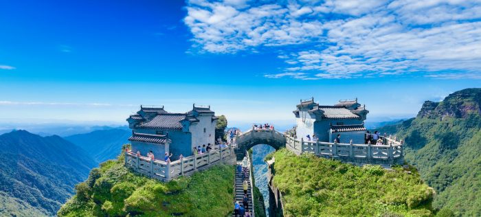 Tra i motivi per cui vale la pena visitare almeno una volta nella vita questo luogo, ci sono i due templi gemelli che sembrano sfiorare il cielo. Si trovano a 2336 metri di altezza sulla Nuova Cima Dorata: sono il tempio di Buddha e quello di Maitreya collegati da un ponte in pietra.