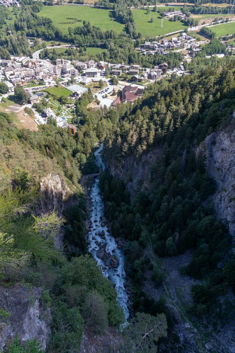 Ma concentrandovi sul panorama circostante e non su quello sotto ai vostri piedi (siete ad un’altezza di 160 metri) potrete abbracciare con lo sguardo la catena montuosa del Monte Bianco, la conca di Pré Saint Didier e la cascata dell’Orrido.