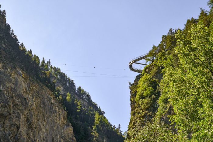 Alzando gli occhi, sul profilo del monte, vedrete una terrazza panoramica con una passerella sospesa dalla quale si gode una vista mozzafiato. Non solo perché il panorama è straordinario, ma anche perché è a strapiombo sulla gola ed il suo pavimento consente di vedere ciò che sta sotto.