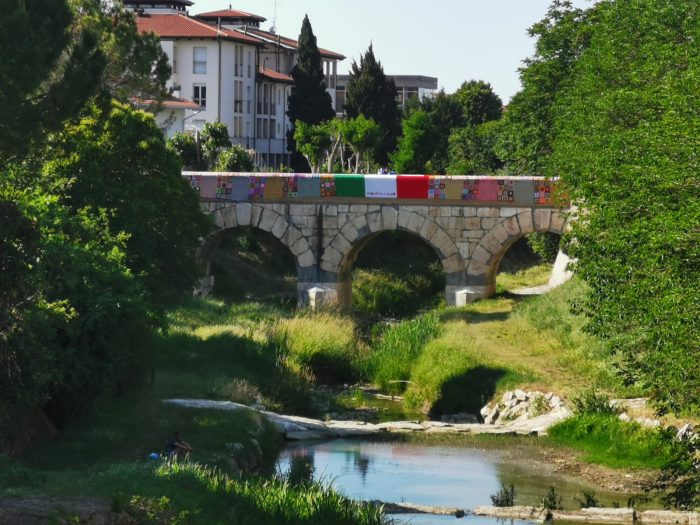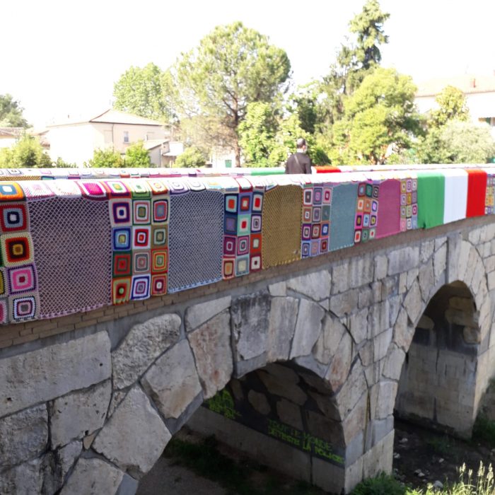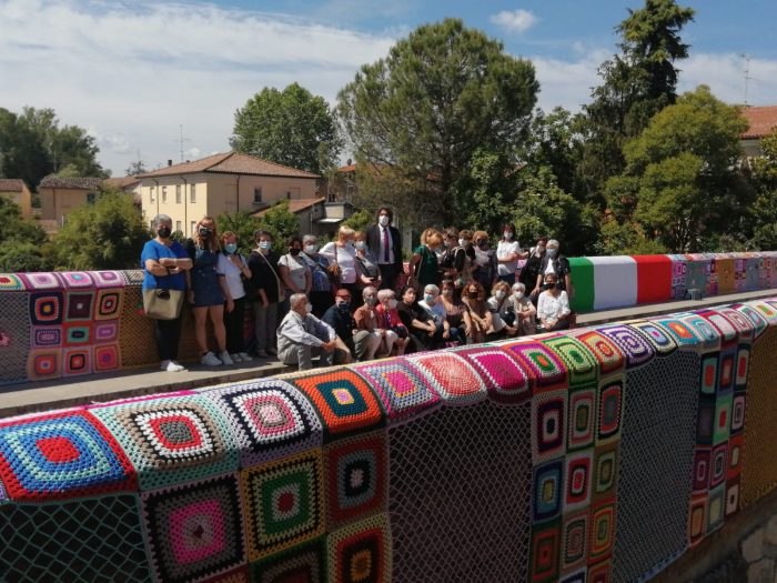 In occasione della Festa della Repubblica il ponte romano sul Rubicone è stato rivestito da mattonelle di lana: l’impresa compiuta dall’ass. ‘Savignano fili e colori’