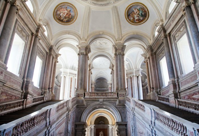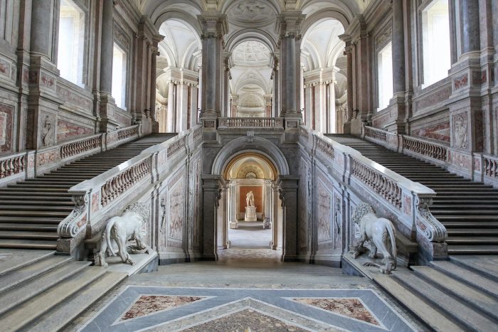 Cinque piani, quattro cortili interni, 47.000 metri quadrati, la Reggia di Caserta affascina e colpisce per la sua bellezza e maestosità che si percepisce fin da subito. Ad accogliere il visitatore e accompagnarlo all’interno della Reggia, uno spettacolare ed elegante scalone d’onore: una scala a doppia rampa che dal vestibolo d’ingresso porta agli appartamenti reali. Al lato dello scalone si si trovano i celebri leoni in marmo. Alzando lo sguardo, il soffitto ammalia due affreschi: Le quattro stagioni e La reggia di Apollo.
