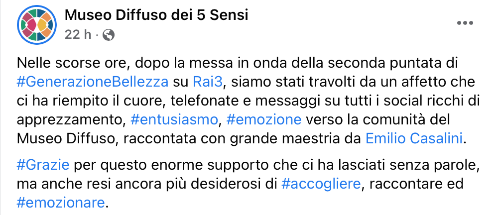 Un progetto, quello del Museo diffuso dei 5 Sensi, che in primis porta i cittadini ad essere consapevoli del valore culturale della propria città così da poterlo condividere con i turisti, considerati ‘cittadini temporanei’. La pagina Facebook del Museo è stata inondata da tantissimi messaggi di congratulazioni e affetto.