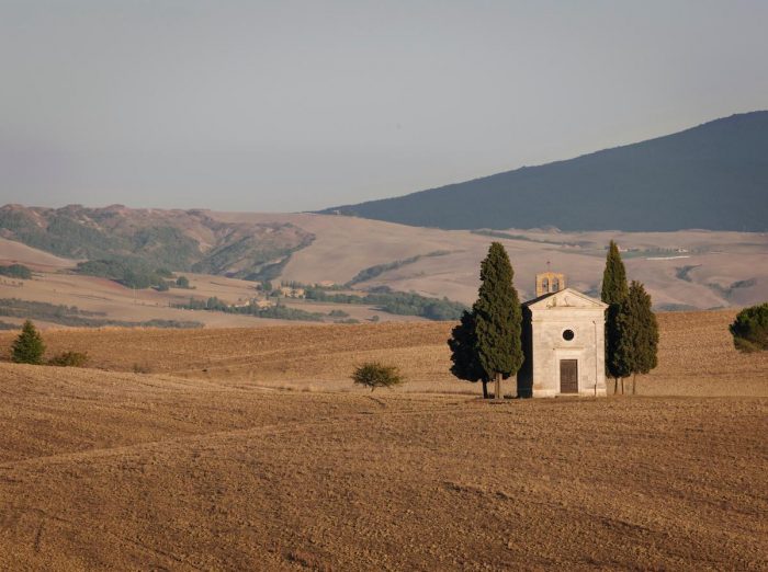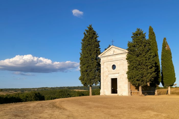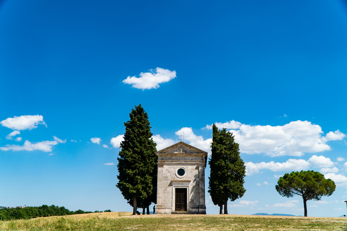 In Val d’Orcia si trova anche uno dei simboli più fotografati; è la splendida Cappella della Madonna di Vitaleta. Questo gioiello di architettura, realizzato nel tardo rinascimento venne danneggiato da un terremoto e ricostruito dall’architetto Giuseppe Partini nel 1884. Patrimonio dell’UNESCO, un accurato restauro l’ha restituita al pubblico nel 2021.