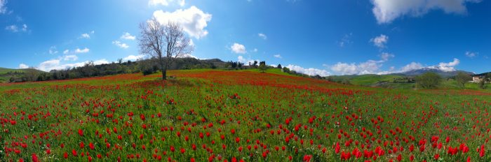 Nel campo davanti al Santuario della Madonna dell’Olio, in primavera una distesa di tulipani rossi ricopre il terreno. Uno spettacolo straordinario che rende il panorama come uscito da un dipinto. Si tratta di tulipani selvatici della specie Tulipano precoce (o Tulipano Raddi) e con i primi tepori primaverili fanno la loro comparsa.