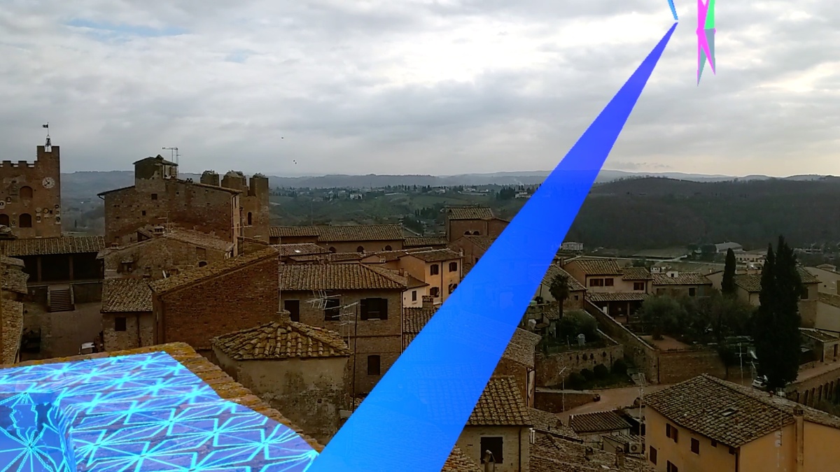 Particolarmente suggestiva è l’esperienza immersiva in realtà mista e aumentata Map (Star) the World – Certaldo, in cui l’artista rivisita alcuni tesori storico-artistici di Certaldo mappando e rivestendo con pattern stellati virtuali alcuni tesori di inestimabile valore storico-artistico custoditi nei musei e nelle chiese di Certaldo per mezzo del visore HoloLens 2 come il “Tabernacolo dei Giustiziati” di Benozzo Gozzoli e la tomba di Boccaccio e le pagine della copia originale del “Decamerone“, in un’inedita ed affascinante rilettura del passato storico, artistico e letterario italiano tra visione analogica e digitale.